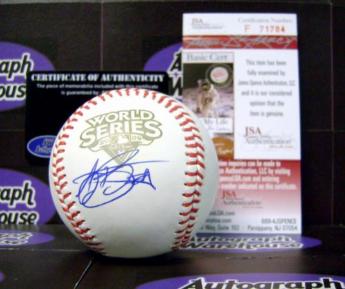 A.J. Burnett autographed 2009 World Series Baseball (JSA) item comes fully certified with a tamper-evident serialized hologram and certificate of authenticity. Officially licensed MLB product.