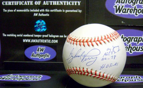 Gaylord Perry Autographed Major League Baseball inscribed Cy Young AL 72 & NL 78 HOF 91. Certificate of Authenticity along with matching tamper-proof holograms from Autograph Warehouse guaranteeing the authenticity of this hand-signed autograph. Autograph Warehouse stakes its reputation on every item it sells and authenticity is their number one priority. Each and every autograph is guaranteed for life to be authentic.