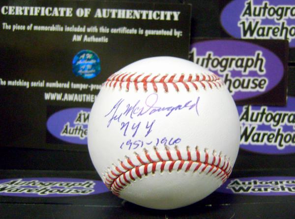 Gil McDougald Autographed Major League Baseball inscribed NY Yankees 51 to 60. Certificate of Authenticity along with matching tamper-proof holograms from Autograph Warehouse guaranteeing the authenticity of this hand-signed autograph. Autograph Warehouse stakes its reputation on every item it sells and authenticity is their number one priority. Each and every autograph is guaranteed for life to be authentic.
