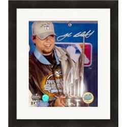 Features- Josh Beckett Autographed 8 x 10 in. Photo - Florida Marlins 2003 World Series Champion World Series Trophy Matted & Framed