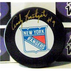 Autograph Warehouse 270871 Andy Bathgate Autographed Hockey Puck - New York Rangers Hall of Fame Gold
