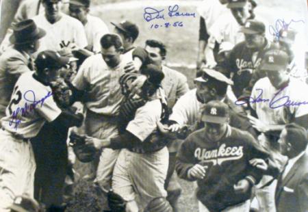 Don Larsen Gil McDougald Tom Carroll Jerry Coleman autographed 11x14 Photo (Yankees 1956 World Series Perfect Game off field) is certified with a tamper-evident serialized hologram and certificate of authenticity.
