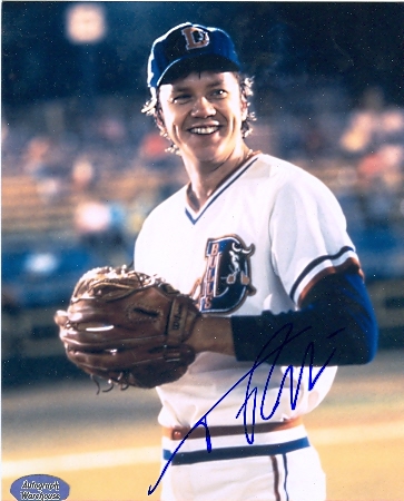 Tim Robbins autographed 8x10 photo (Bull Durham) is certified with a tamper-evident serialized hologram and certificate of authenticity.
