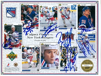 Randy Moeller Jan Erixon Brian Leetch Joey Kocur Mark Hardy Mike Gartner autographed collectors sheet 8x11 (New York Rangers 1991)''.