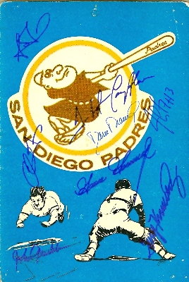 San Diego Padres autographed logo board signed by Steve Finley Johnny Grubb Goose Gossage Trevor Hoffman Terry Kennedy Dave Dravecky Jim Leyritz Larry Anderson & Chris Gomez. Item certified with a tamper-evident serialized hologram and certificate of authenticity.