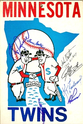 Minnesota Twins autographed logo board signed by Ron Perranoski Ken Landreaux John Castino Dave Goltz George Frazier Geoff Zahn & Lecroy. Item certified with a tamper-evident serialized hologram and certificate of authenticity.