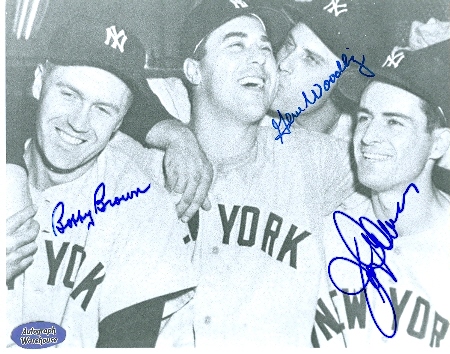 Gene Woodling Bobby Brown Jerry Coleman autographed 8x10 Photo (New York Yankees Lockeroom Celebration). Item pictured above comes with autographwarehouse certificate of authenticity and numbered hologram. Item comes fully certified with a tamper-evident serialized hologram and certificate of authenticity.