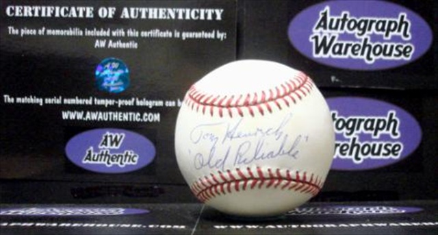 Tom Henrich autographed American League baseball inscribed Old Reliable. A Certificate of Authenticity along with matching tamper-proof holograms from Autograph Warehouse guaranteeing the authenticity of this hand-signed autograph. Item comes fully certified with a tamper-evident serialized hologram and certificate of authenticity.