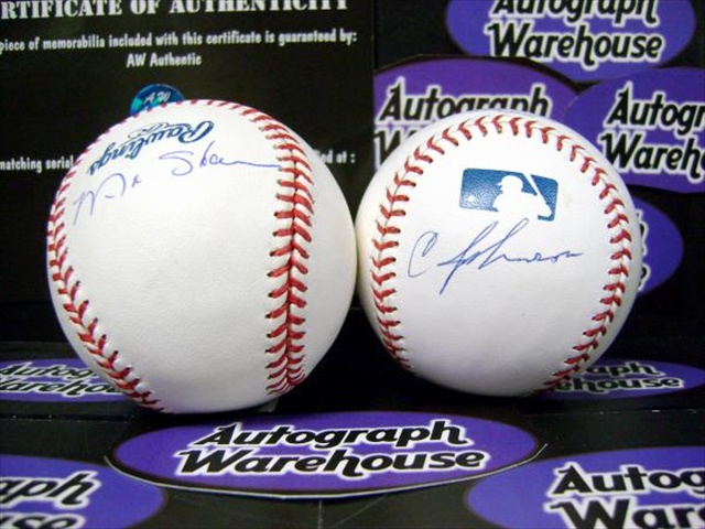 Cliff Johnson & Matt Stairs autographed Major League Baseball (Pinch Hit Home Run Kings 20 & 21 Career) signed on opposite panels. Item certified with a tamper-evident serialized hologram and certificate of authenticity.
