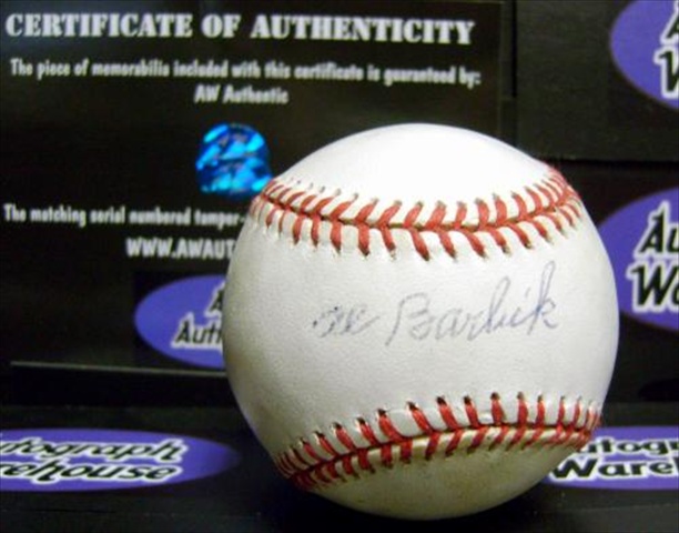 Al Barlick signed National League Baseball (Hall of Fame Umpire). Item comes fully certified with a tamper-evident serialized hologram and certificate of authenticity. Comes fully certified with Certificate of Authenticity and tamper-evident hologram.