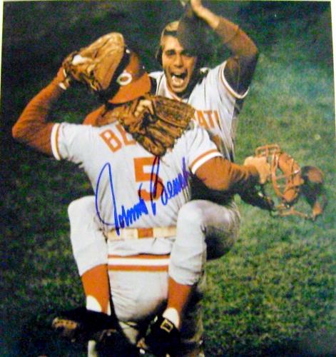 Johnny Bench autographed 11x11 Photo (Cincinnati Reds 1975 World Series Celebration). Item comes fully certified with a tamper-evident serialized hologram and certificate of authenticity.