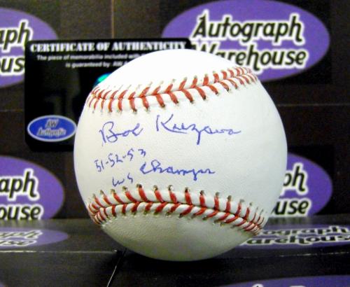 Bob Kuzava autographed Baseball inscribed 1951-52-53 WS Champs. Item comes fully certified with a tamper-evident serialized hologram and certificate of authenticity.