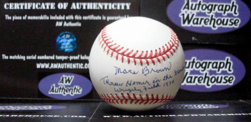 Mace Brown autographed National League Baseball inscribed "Threw Homer in Gloamin 1937" comes with a Certificate of Authenticity along with matching tamper-proof holograms from Autograph Warehouse guaranteeing the authenticity of this hand-signed autograph.