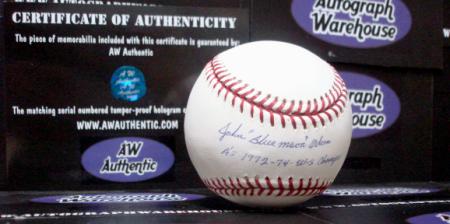 John 'Blue Moon' Odom autographed Major League Baseball inscribed 1972-74 WS Champs comes with a Certificate of Authenticity along with matching tamper-proof holograms from Autograph Warehouse guaranteeing the authenticity of this hand-signed autograph.