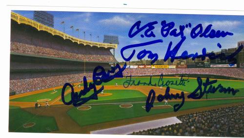 Yankee Stadium post card 3.5x7 autographed by Yankees Pat Olsen Tom Henrich Johnny Sturm Frank Crosetti and Andy Carey.Item comes fully certified with a tamper-evident serialized hologram and certificate of authenticity.
