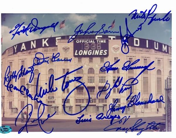 Yankee Stadium 8x10 photo autographed by 14 New York Yankees Legends like World Champions Gossage Larsen Slaughter.Horace Clarke Sain McDougald Rick Cerone Pagliarulo Torrez Shantz Dent Perry Arroyo & Blanchard.Item comes fully certified with a tamper-evident serialized hologram and certificate of authenticity.