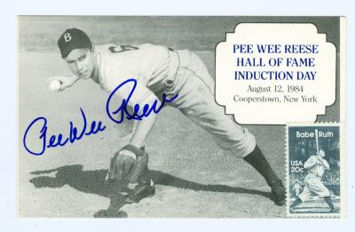 Pee Wee Reese autographed postcard 3. 5x5. 5 (Brooklyn Dodgers) Babe Ruth Stamp 1984 TCMA HOF Induction (67) comes with a Certificate of Authenticity along with matching tamper-proof holograms from Autograph Warehouse guaranteeing the authenticity of this hand-signed autograph.