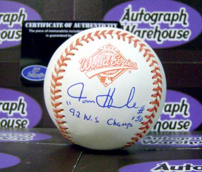 Tom Henke autographed 1992 World Series Baseball inscribed 92 WS Champs (slight toned). Item comes fully certified with Certificate of Authenticity and tamper-evident hologram.
