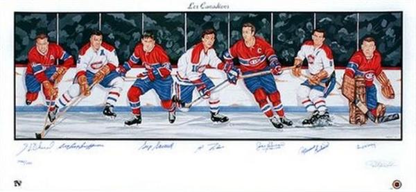 Montreal Canadiens Hall Of Famers Lithograph: 18 x 36 full color limited edition lithograph autographed by Guy Lafluer Maurice Richard Henri Richard Gump Worsley Jean Beliveau Bernie Geoffrieon and Serge Savard item comes fully certified with a tamper-evident serialized hologram and certificate of authenticity.