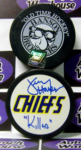 Jerry Houser autographed hockey puck (Slap Shot) Dave Killer Carlson. Qualified with a tamper-evident serialized hologram and certificate of authenticity.