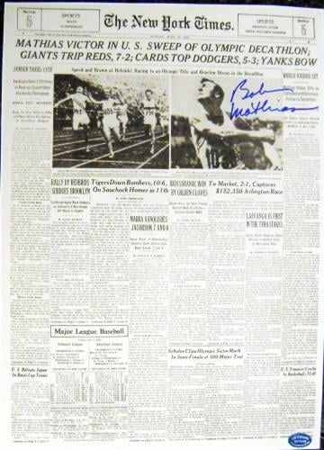Bob Mathias autographed photo (USA Olympic Gold Medal USA July 27 1952) 11x14 New York Times Cover Page Photo. Item comes fully certified with a tamper-evident serialized hologram and certificate of authenticity.