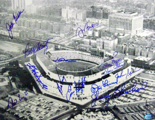 New York Yankees Yankee Stadium autographed photo 11x14 signed by 13 players (Circa 1960s stadium image) Gil McDougald Bobby Shantz Irv Noren Enos Slaughter Tommy Byrne Spec Shea Johnny Sain Don Larsen Johnny Blanchard Bob Turley Jake Gibbs Jim Bouton Phil Linz. Item comes with a Certificate of Authenticity along with matching tamper-proof holograms from Autograph Warehouse guaranteeing the authenticity of this hand-signed autograph.