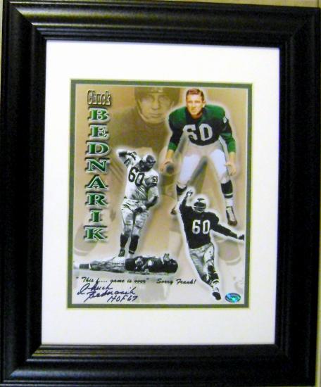 Chuck Bednarik autographed 8x10 Photo (Collage) "HOF 67" (Philadelphia Eagles Gifford Hit) FRAMED. This item comes with a Certificate of Authenticity along with matching tamper-proof holograms from Autograph Warehouse guaranteeing the authenticity of this hand-signed autograph.