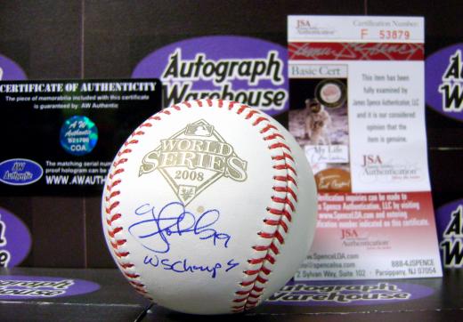Greg Dobbs autographed 2008 World Series Baseball (JSA). Item comes fully certified with a tamper-evident serialized hologram and certificate of authenticity.