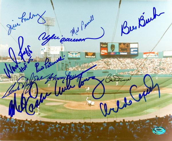 Fenway Park 8x10 Photo Autographed by 12 Boston Red Sox Legends Johnny Pesky Wade Boggs Bill Buckner Jim Lonborg Rico Petrocelli Bobby Doerr Mike Torrez Orlando Cepeda Mel Parnell Andre Dawson Frank Malzone &Mike Easler.