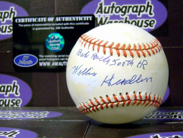 Willis Hudlin autographed American League Baseball inscribed Babe Ruth 500th HR (Yellowed spotty and he used white out). Item comes fully certified with a tamper-evident serialized hologram and certificate of authenticity.
