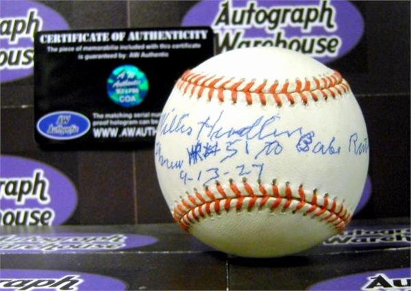 Willis Hudlin autographed American League Baseball inscribed Threw HR 51 to Babe Ruth 9 13 27 (toned condition) code 6704. Item comes fully certified with a tamper-evident serialized hologram and certificate of authenticity.