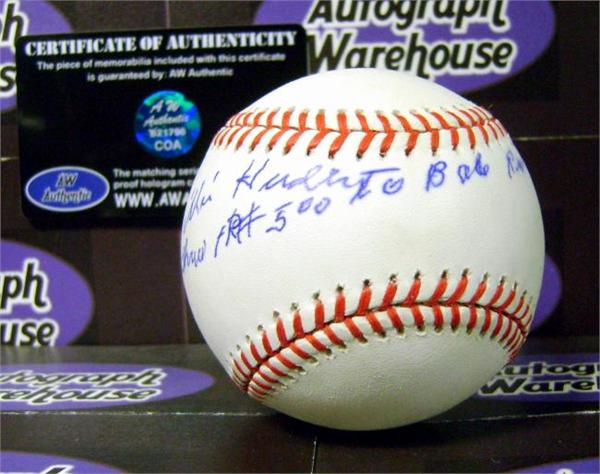 Willis Hudlin autographed American League Baseball inscribed Threw HR 500 to Babe Ruth (toned condition) code 6706. Item comes fully certified with a tamper-evident serialized hologram and certificate of authenticity.