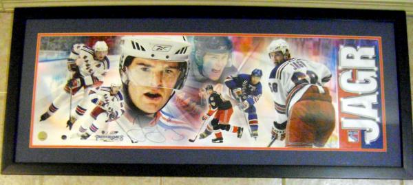 Jaromir Jagr autographed photo (New York Rangers) Panoramic 15x36 matted and framed. Item comes fully certified with a tamper-evident serialized hologram and certificate of authenticity.