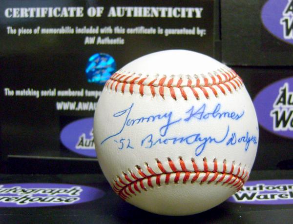 Tommy Holmes signed National League baseball inscribed 52 Brooklyn Dodgers. Items come fully certified with Certificate of Authenticity and tamper-evident hologram.