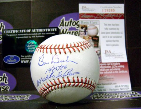 Mookie Wilson and Bill Buckner autographed Baseball inscribed 10/25/86 (JSA). Item comes fully certified with a tamper-evident serialized hologram and certificate of authenticity.