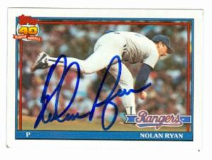 Nolan Ryan autographed baseball card (Texas Rangers) 1991 Topps #1 Nolan Ryan Authentication Hologram. This item comes fully certified with Certificate of Authenticity and tamper-evident hologram.