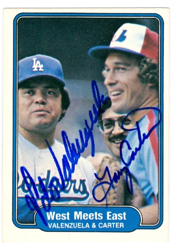 Fernando Valenzuela and Gary Carter autographed baseball card 1982 Fleer #635 West Meets East (Dodgers Expos). This item comes fully certified with Certificate of Authenticity and tamper-evident hologram.