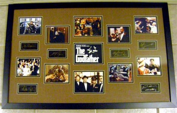 The Godfather Masterpiece framed and matted with Laser Signatures of Marlon Brando James Caan Diane Keaton Al Pacino &Bob Duvall TAN. This item comes fully certified with Certificate of Authenticity and tamper-evident hologram.