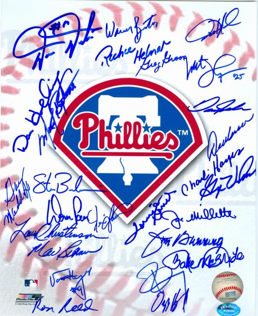 Philadelphia Phillies logo 8x10 photo autographed by 26 players Bunning Maddox Daulton Bedrosian and more item comes fully certified with a tamper-evident serialized hologram and certificate of authenticity.